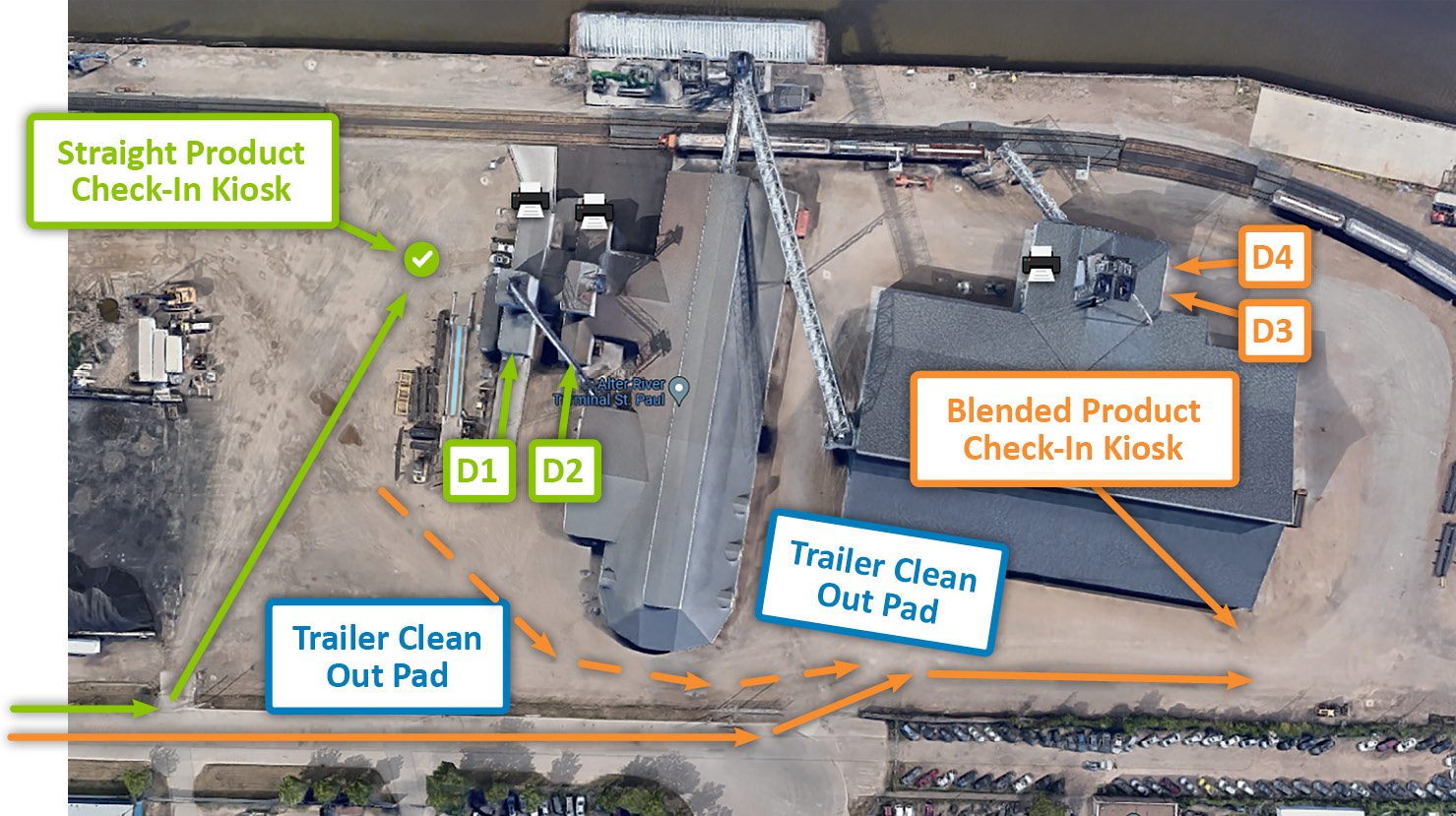 If directed to Door 3 or 4, proceed to those doors via the dashed orange route. You will not need to re-enter your release number at the Blended Product Check-In Kiosk. If loading blended product, proceed through the second gate to the Blended Product Check-In Kiosk via the solid orange route. You will be directed to either Door 3 or 4. When you are next to load, contact the scale operator via the phone intercom mounted at that door. After loading, pull out of the load bay, walk back to the exit door of that bay, sign and print your ticket.